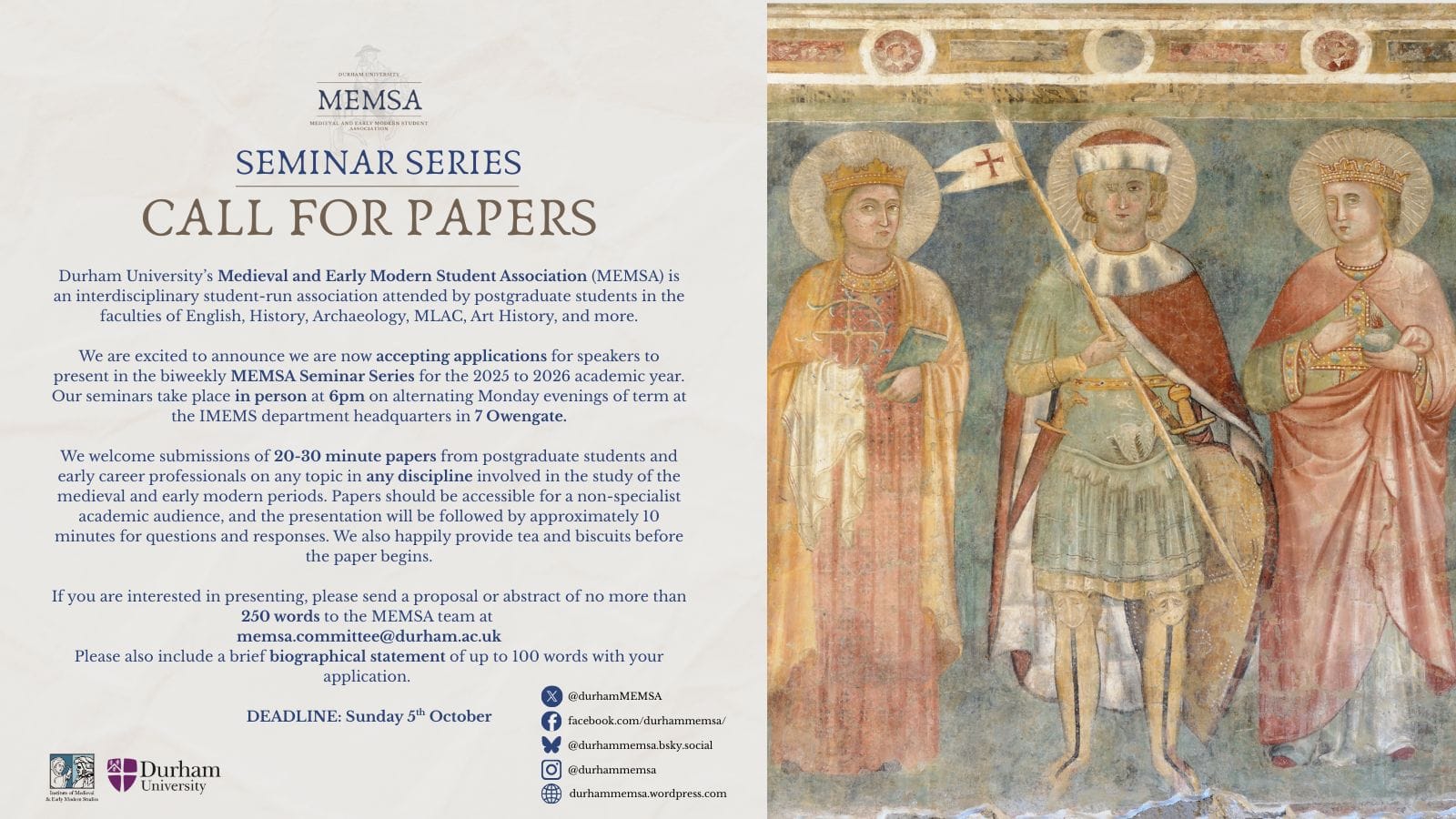 Durham University’s Medieval and Early Modern Students Association (MEMSA) is an interdisciplinary student-run association attended by postgraduates in the faculties of English, History, Archaeology, MLAC, Art History, and more.